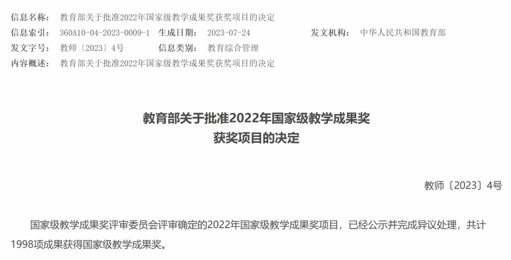 国家级教学成果奖是教育部为了奖励取得教学成果的集体和个人,鼓励教育工作者从事教育教学研究,提高教学水平和教育质量而设立的最高级别的奖励,是目前我国教育领域政府类的最高奖励,每四年评选一次。