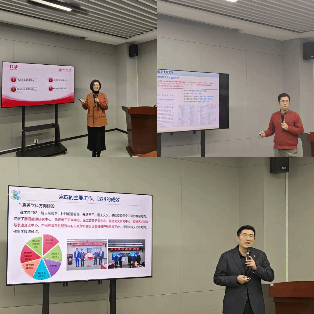 为推进院内各中心深度融合与交流,开辟事业发展新赛道,前沿能源、先进电子、医工交叉、基础科学中心主任对标“十四五”规划,相继汇报了本单位全年开展的中心工作、取得的成效、存在的问题及下一阶段工作计划。