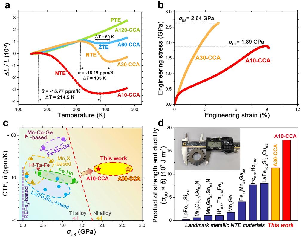 负热膨胀材料是降温时产生反常膨胀(即热缩冷胀)的特种功能材料,在精密传动等高技术领域应用前景广阔。空天大温差复杂环境应用要求负膨胀材料不仅服役温域宽,而且具备良好的机械承载性。然而,多数负膨胀材料为本征脆性的金属间化合物,强度不足;尽管少部分具有负热膨胀效应的一级相变合金力学性能良好,但存在服役温域窄的先天不足。因此,亟需研发同时具有高强度和宽使用温域的负膨胀材料,从而满足上述苛刻要求。
