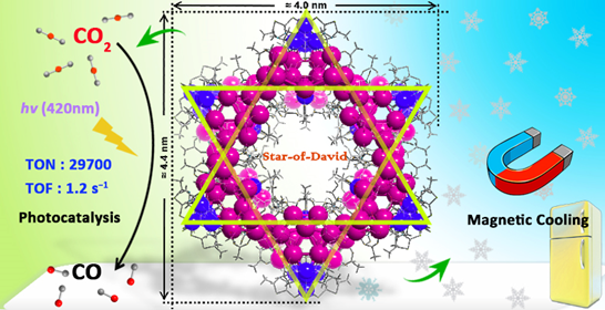近日,在郑彦臻教授指导下,西安交通大学bwin博士后陈伟鹏采用“混合配体”策略,在溶剂热条件下成功的制备出一例高核过渡-稀土混金属纳米团簇—{Ni36Gd102}。该团簇分子拥有六芒星状的形状,为目前报道的第二大3d-4f混金属团簇,并具有良好的溶液稳定性。因团簇金属镍离子存在潜在的空余配位点,因此该化合物可以选择性地在可见光下催化还原CO2为CO(90.2%),其TON为29700、转换频率为1.2 s−1,超过了多数同类型的催化剂。而该团簇含有的大量稀土钆元素也使得该分子材料在2K 和ΔH = 7 T时产生了41.3 J·kg–1·K–1的磁熵变,在低温磁制冷方面具有较好的应用潜力。与此同时,我们利用周期性密度泛函理论及循环伏安法对催化机理予以解释。该工作不仅为3d-4f混金属团簇的设计合成提供了新的思路,同时也将为稀土基纳米团簇的溶液稳定性、催化性能的探究及功能拓展提供了借鉴与理论依据。