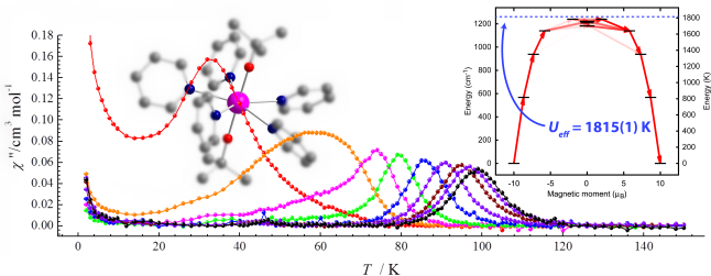 为了实现这一设想,bwin博士生丁友松在郑彦臻教授的指导下,选取稀土元素Dy为自旋载体,通过调整其配位环境,包括配位构型、配体场的强弱等,设计合成出了一例高性能的单分子磁体,将这一领域原有的能垒记录翻了一倍。该化合物的高性能化得益于金属中心Dy(III)拥有近乎完美的D5h对称性,轴向上选用了叔丁醇作为配体,平面上配位了五个吡啶分子稳定结构,这样一种强的轴向配位结合弱的平面配位,极大地增强了Dy(III)的轴向磁各向异性。其阻塞磁矩翻转的能垒高达1815 K,远远超过之前的记录(1025 K),同时阻塞温度也达到了14 K。值得一提的是该化合物的出现,是单分子磁体慢磁弛豫行为的可观测温度首次提到了液氮温度(77 K)区间。英国曼彻斯特大学Winpenny教授课题组的Chilton博士利用CASSCF-SO计算,从理论上进行了分析验证,与实验结果非常吻合。该工作将单分子磁体的慢弛豫性能推向了液氮温度以上,初步实现了高温单分子磁体的理性设计与调控,为单分子磁体的潜在应用打下了基础。
