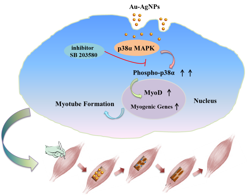 示意图:纳米贵金属材料介导骨骼肌形成过程