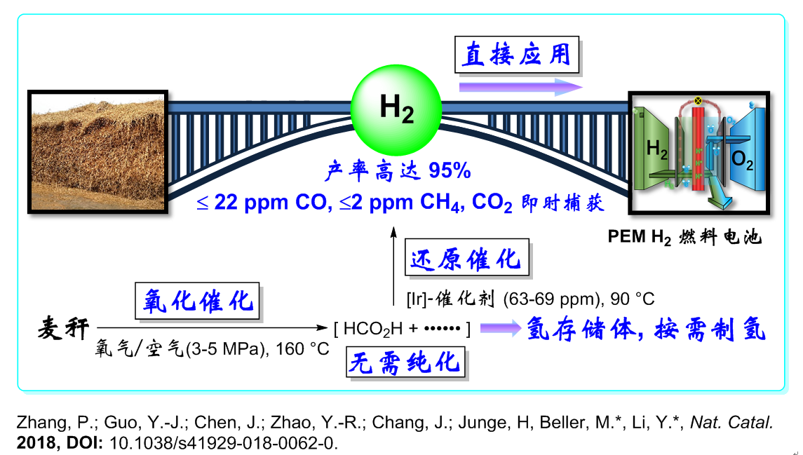 近日,bwin有机化学中心李洋研究员课题组和德国莱布尼茨催化研究所Matthias Beller教授课题组合作,经过近三年的研究,发展了利用非粮生物质,如麦秆、玉米秆、水稻秆、芦苇 、甘蔗渣、竹屑,以及日常生活垃圾,如硬纸板、废报纸为原料,通过串联160 °C下把生物质中的主要成份纤维素和半纤维素转化为甲酸的“氧化催化”和90 °C 下生物质水解氧化反应液放氢的“还原催化”,期间无需纯化,即“一锅两步法”进行制氢,产率高达95%; 伴生的二氧化碳(CO2)经碱液捕获转化为碳酸盐,产生的一氧化碳(CO)及甲烷(CH4)的含量分别不超过22 ppm及2 ppm;直接应用于氢燃料电池转化为电能。实现了相对温和条件下高效高选择性地制氢。该制氢路线可以进行实验室规模的10克级放大反应。