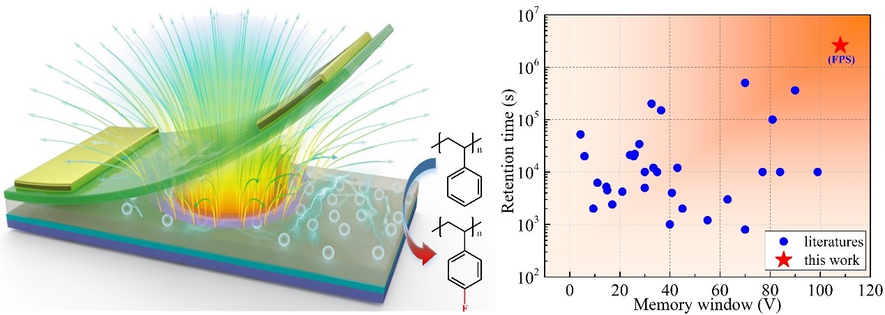近日,bwin鲁广昊教授课题组与电气学院李盛涛教授课题组、理学院张志成教授课题组、中科院长春应用化学研究所崔冬梅研究员课题组开展合作,通过自由基聚合合成了一种新型绝缘聚合物分子:无规4-氟代聚苯乙烯(Poly(4-fluorostyrene),FPS)。该聚合物具有较高的深电荷陷阱密度、高击穿场强、高热稳定性和疏水性,可实现高度稳定的驻极体。以FPS薄膜作为栅极介电层,并以C12-BTBT作为半导体层制备的有机场效应晶体管具有高达11.2 cm2·V-1·s-1的场效应迁移率,高达107的开/关比和较小的阈值电压。与广泛使用的聚苯乙烯相比,FPS的电子和空穴陷阱密度及陷阱能级均有所上升,带来6.8×1012 cm-2的高带电量。利用FPS制备的OFET存储器件可在大于100 V的宽存储窗口下工作,并具有在空气环境中大于一个月的存储稳定性。