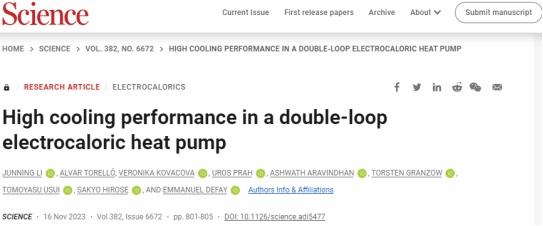 20231116日,卢森堡科学技术研究所Emmanuel Defay教授团队在Science期刊发表题为“High cooling performance in a double-loop electrocaloric heat pump”的电卡制冷技术研究论文,Emmanuel Defay教授为论文通讯作者。论文第一作者为李俊宁博士(硕士毕业于西安交大bwin,导师:娄晓杰教授)。
