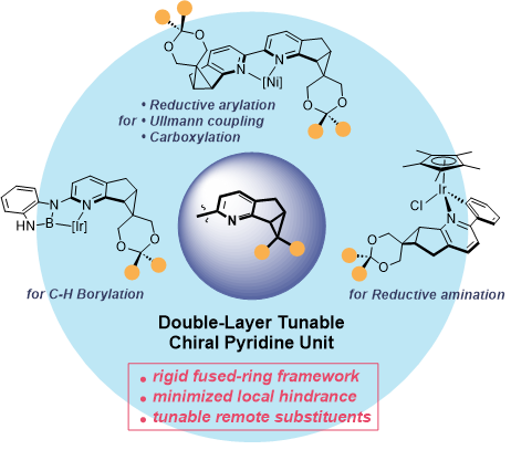 针对上述困难与挑战,李鹏飞教授团队通过分子层面的理性设计,开发了一类具有刚性稠环骨架、结构高度可调节的手性吡啶单元,同时实现了中心金属近程位阻最小化和远端结构高度可修饰,克服了立体选择性和催化活性之间的矛盾。有别于传统手性配体的设计思路,它具有内松外紧的双层结构特征,与广谱性酶(如细胞色素P450)异曲同工。随后,作者在此基础上发展了一系列手性螯合配体,并通过机理各异的过渡金属催化不对称反应展示了新配体设计的合理性和有效性,包括对映选择性镍催化还原偶联反应、铱催化C–H硼化反应和铱催化还原氨化反应。结合实验和理论计算研究,充分展示了上述新型含吡啶手性配体在同时确保高催化活性和立体选择性方面的优异性能,进一步支撑了双层调控的手性配体设计理念。未来,新型手性吡啶单元将会不断启发新型手性配体和催化剂的开发,不断促进各种高效的不对称催化反应持续涌现。