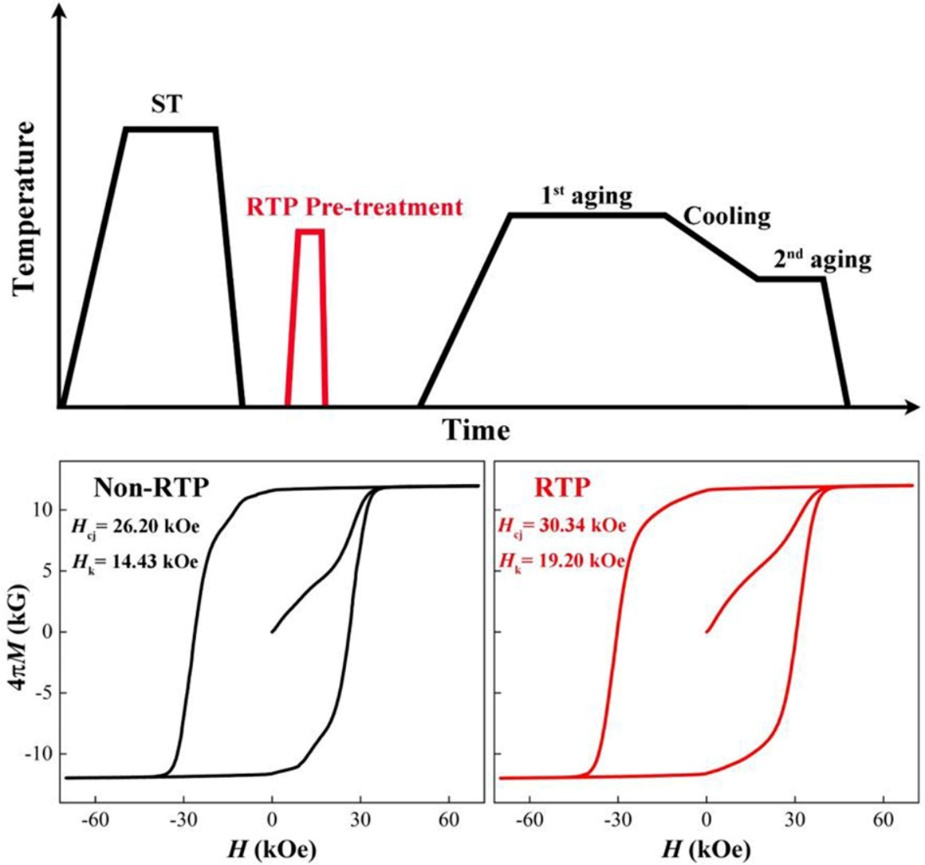 Sm2Co17轻稀土永磁材料是高温磁性最强的永磁材料,是使用温度超过300℃的新一代轨道交通和电动飞机等永磁驱动系统的首选。历经40多年发展,该类材料的剩磁(充磁后向外界提供的磁感应强度)已接近理论值,但是其矫顽力和膝点磁场(反映抗退磁能力的指标,值越大抗退磁能力越强)却远低于理论值。马天宇教授团队在前期深入研究该类材料显微组织演变和反磁化机制的过程中,发现一种由结构缺陷聚集所形成的2:17R’新相,这个相对磁性能有害,是导致矫顽力和膝点磁场低于理论值的重要原因[《材料学报》(Acta Materialia202 (2021) 290 – 301244 (2023) 118580]。最近,团队发展了一种提高2:17型钐钴永磁材料矫顽力和膝点磁场的新方法。与传统的等温时效和慢冷处理工艺不同,该团队在等温时效处理之前引入了额外的快速升降温RTP预处理(图1),通过增多点缺陷和同时保持高密度线缺陷(位错),有效提高了对矫顽力起关键作用的1:5H析出相的形核率,同时加快了等温时效过程中结构缺陷的分解速度。对比结果显示,在后续的全程热处理之后,1:5H析出相显著增多,同时2:17R’明显减少,从而使矫顽力(Hcj)提高近20%、膝点磁场(Hk)提高30%以上,磁体综合磁性能超过成分相近的商业磁体相关工作已申报国家发明专利(公开号 CN2023105067717)。相关论文以《快速升降温预处理促进形核增强Sm2Co17型磁体硬磁性》(Rapid-thermal-process pre-treatment promoted precipitation towards strengthening hard magnetism of Sm2Co17-type magnets)为题发表在金属材料领域旗舰刊物《材料学报》(Acta Materialia 274 (2024) 119966前沿院助理教授宋欣为论文第一作者,马天宇教授为论文通讯作者合作者包括东北大学黄丹博士、中科院赣江创新研究院周相龙博士、杭州电子科技大学赵利忠教授和刘孝莲博士、香港城市大学任洋教授西北工业大学刘峰教授。