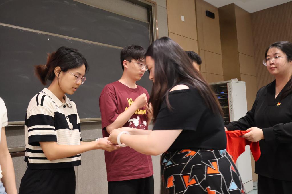 学院党委委员李鹏飞、李惠昊为新发展党员佩戴党员徽章。