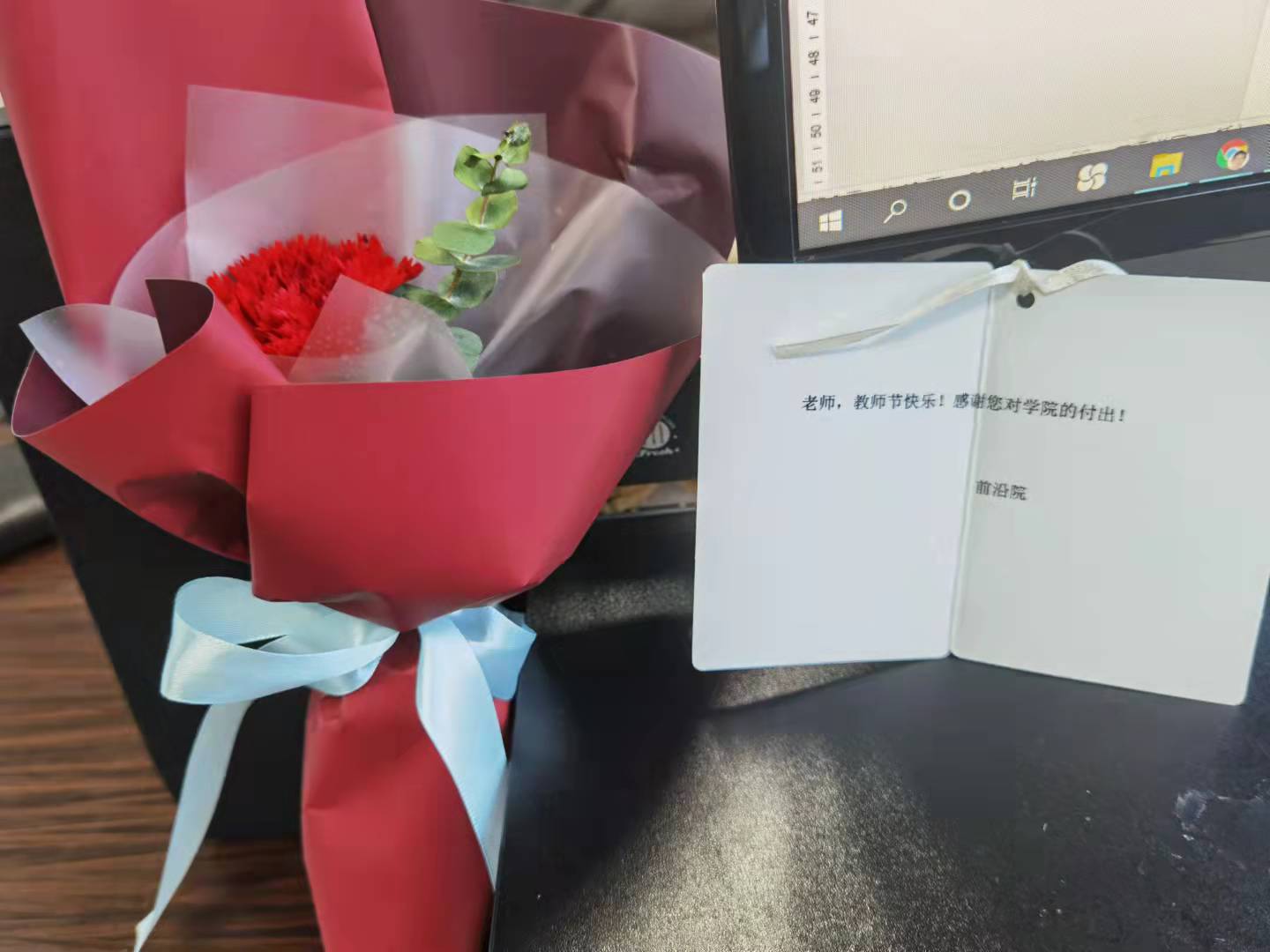 工作人员手捧鲜花走进办公室和教室。“老师,您辛苦了,衷心祝愿您节日快乐”!当饱含情意的玫瑰送到教师手上,在温馨的祝福声中,老师们的脸上写满了惊喜和感动。鲜花既表达了对老师们长久以来辛勤耕耘的无限敬意,也是对老师们爱校如家、爱生如子、爱岗敬业的感激。